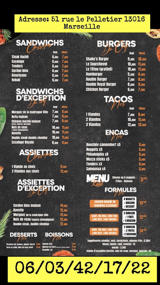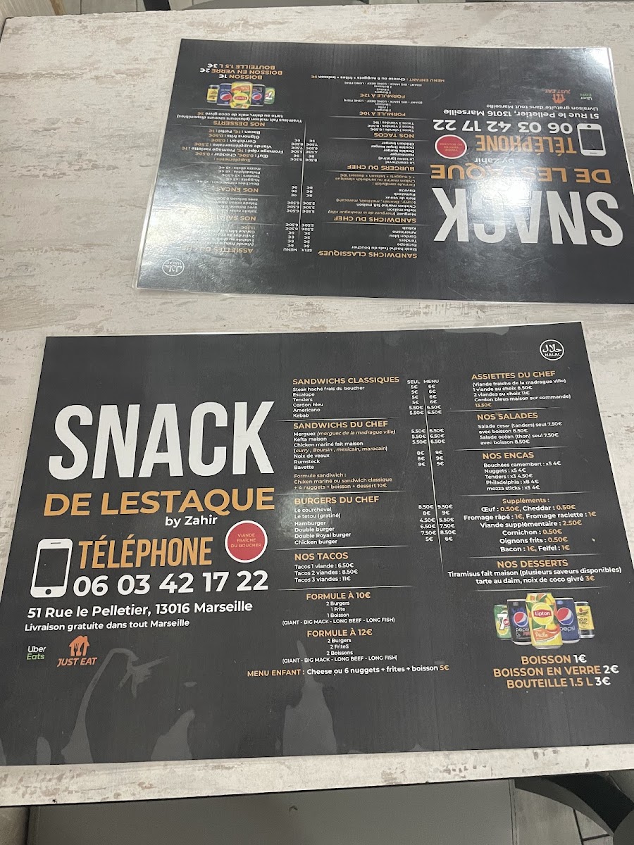Introducing the menu at Snack de l’Estaque Gare « by Zahir », located in the vibrant heart of Marseille. This gem is a culinary haven where friendly service meets generous portions of deliciousness. The menu boasts an impressive selection, highlighted by their renowned merguez sausages and mouthwatering cordon bleu, both celebrated for their quality and freshness sourced directly from a local butcher.
